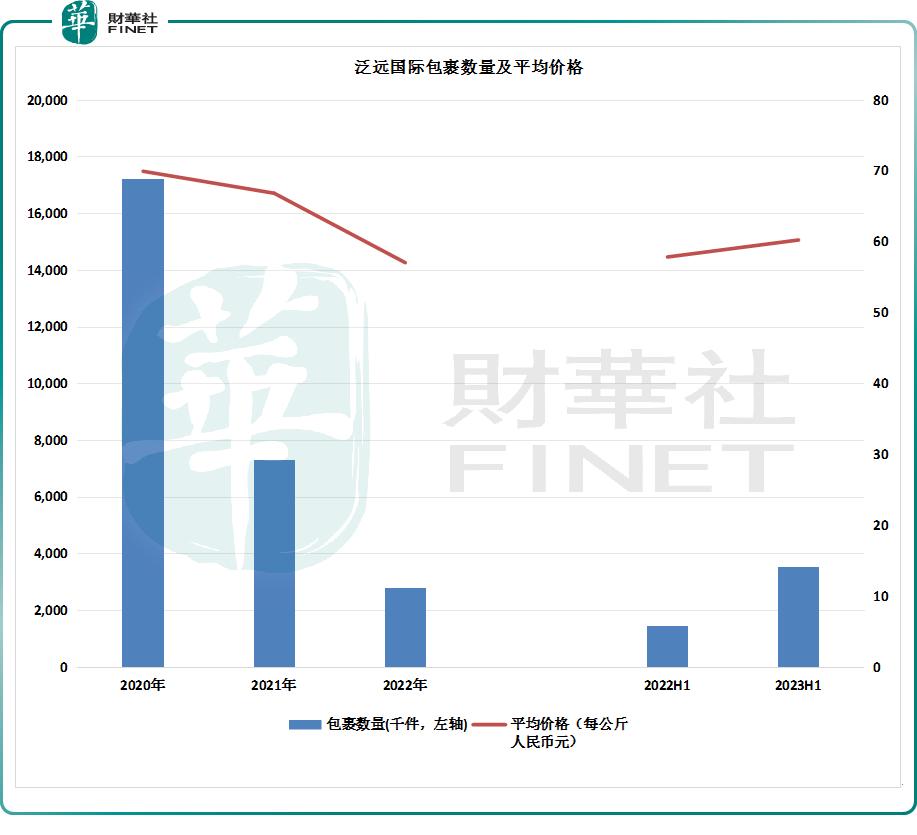 但由于外部环境的影响,泛远国际寄往美国的包裹数量持续受到冲击,从而影响整体包裹量的增长。而2020年至2022年期间,泛远国际的包裹数量和寄件均价就已经出现“量价齐跌”的趋势。
