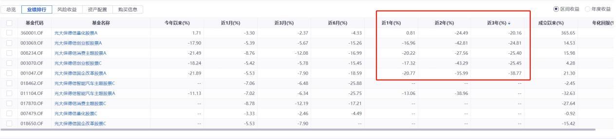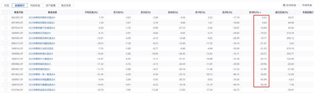 拉长时间线来看,截至12月20日,以近3年为区间,公司有可比数据的14只偏股混合型基金中,只有2只收益为正,跌幅超过20%的产品有8只,表现较差的光大保德信均衡精选混合A类基金亏损达到56.30%。