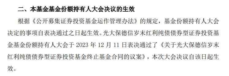 《议案》显示,自12月12日起,光大保德信岁末红利纯债将进入清算程序,公司将不再接受投资人提出的基金份额申购、赎回、定期定额投资、基金转换等业务申请。