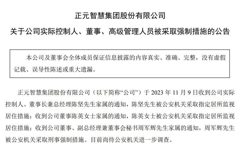 11月9日晚间,正元智慧集团股份有限公司(以下简称“正元智慧”,300645.SZ)发布实际控制人、董事、高级管理人员被采取强制措施的公告。之后第一个交易日,公司股价出现“20CM”跌停,次日,股价创下近2年来的新低。
