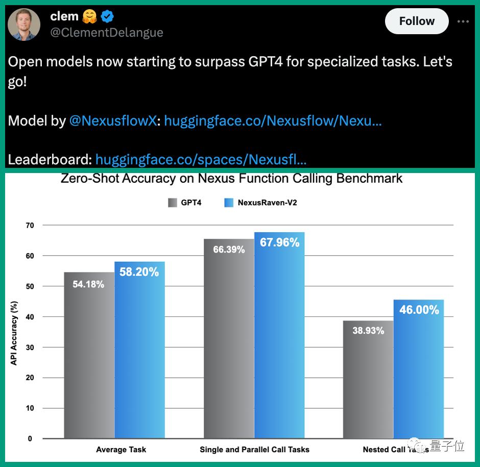 它在短短不到3个月的时间就发布了2代大模型NexusRaven,其中第二代直接单点突破GPT-4,引起开源社区大量关注。