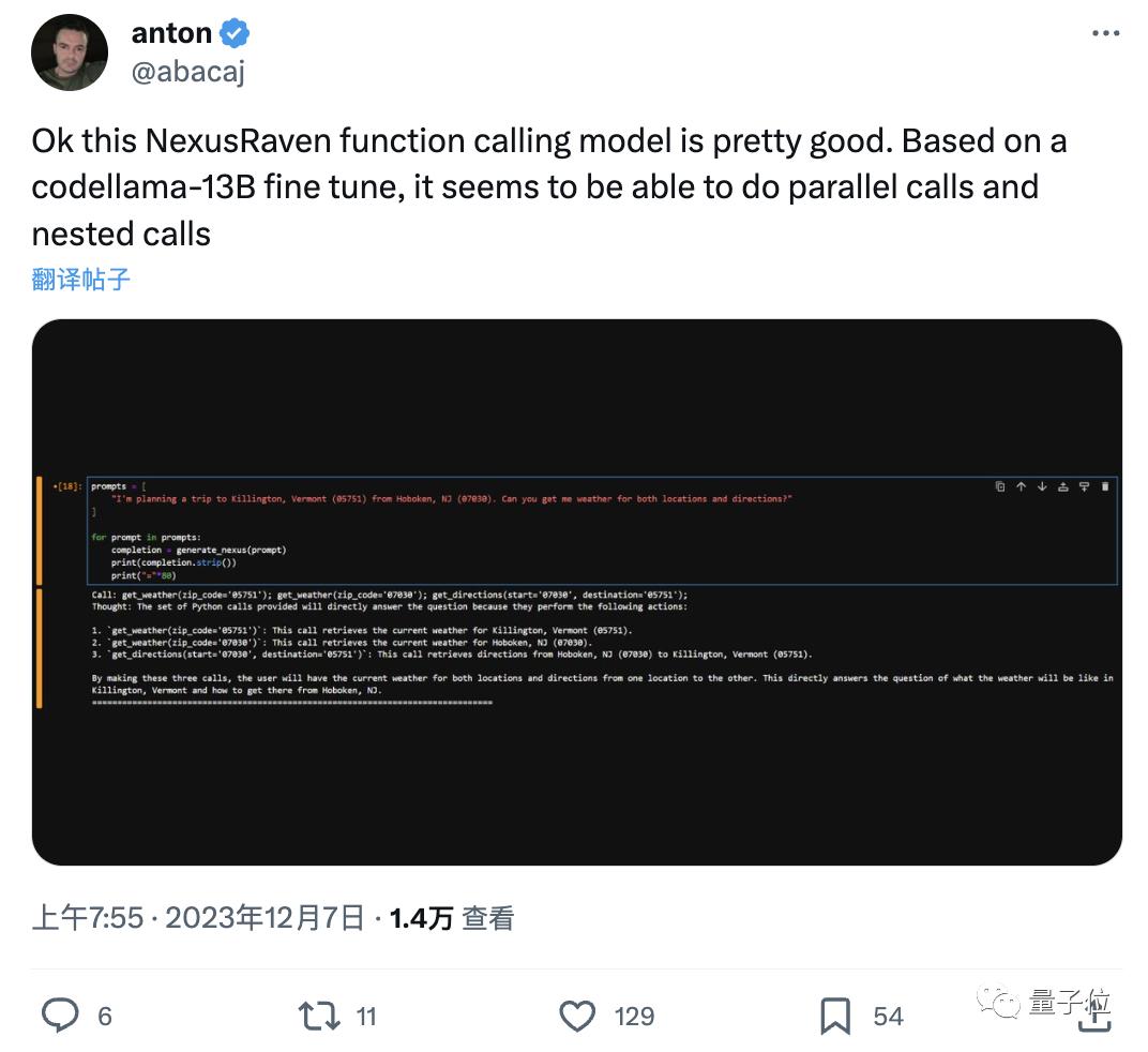 如果你对NexusRaven-V2模型本身感兴趣,团队也已经发布了专门的Python包“nexusraven”,使用它就可以将模型与你已有的copilot或agent工具进行无缝集成(Colab上有教程)。