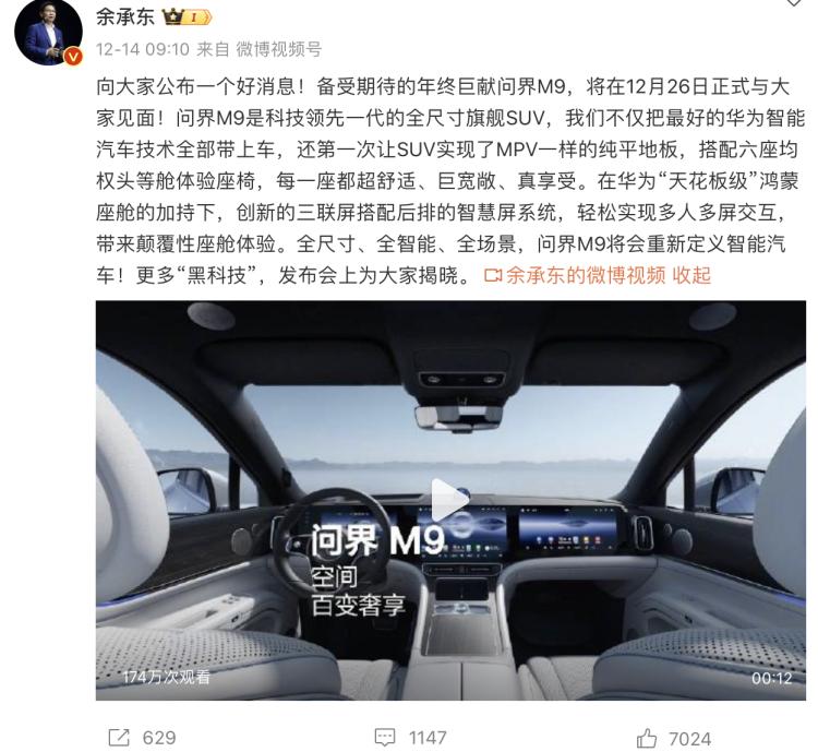 而杀伤力最大的无疑是问界。12月14日,随着余承东在微博宣布问界M9的上市时间,避开华为声量的26日之后的时间,就成为各家车企争抢的节点。