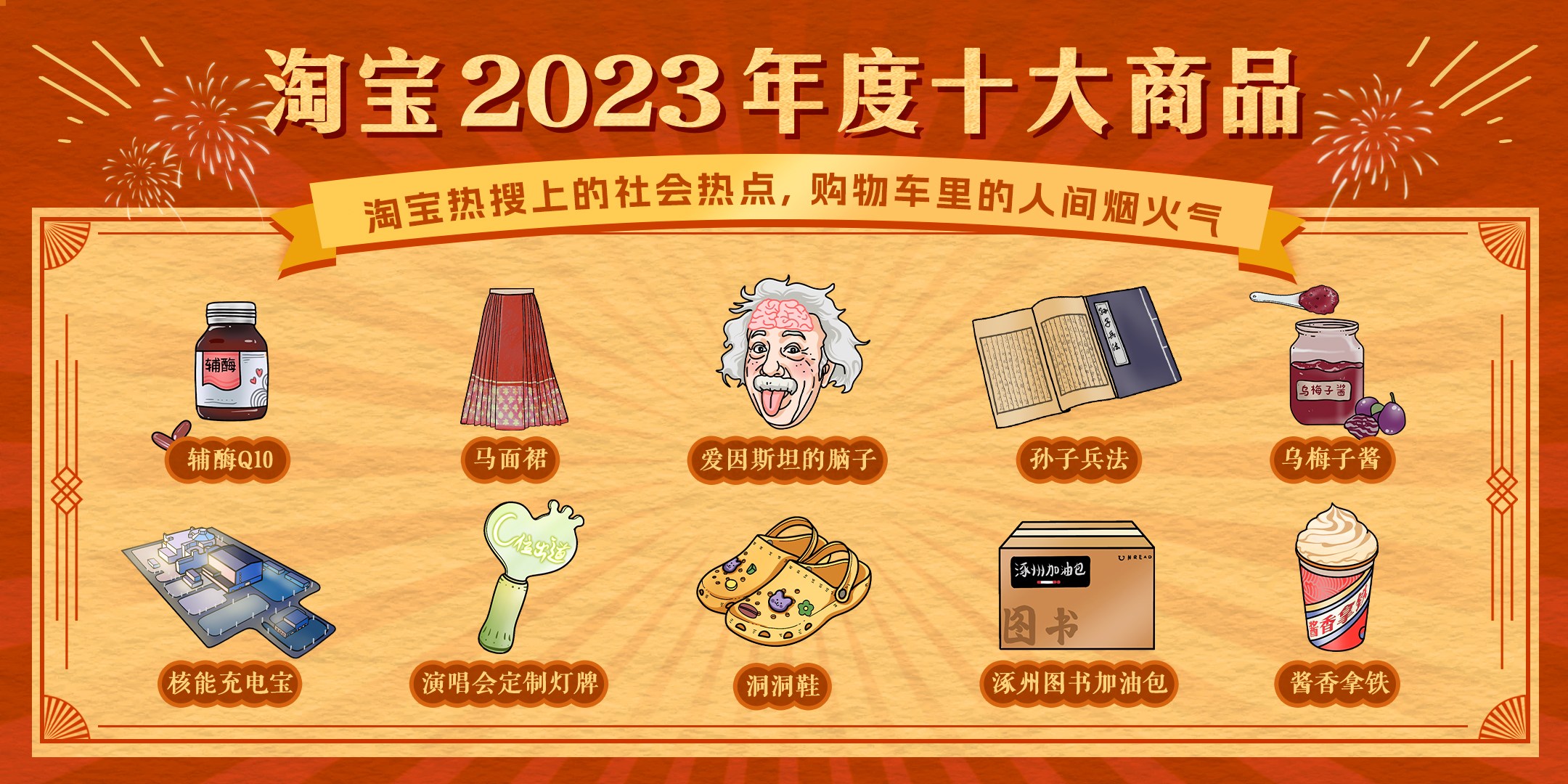 12月25日,淘宝正式公布了2023年度十大商品榜单。辅酶Q10、洞洞鞋、“爱因斯坦的脑子”、演唱会灯牌、孙子兵法、乌梅子酱、酱香拿铁、马面裙、核能充电宝、“涿州图书加油包”入选。
