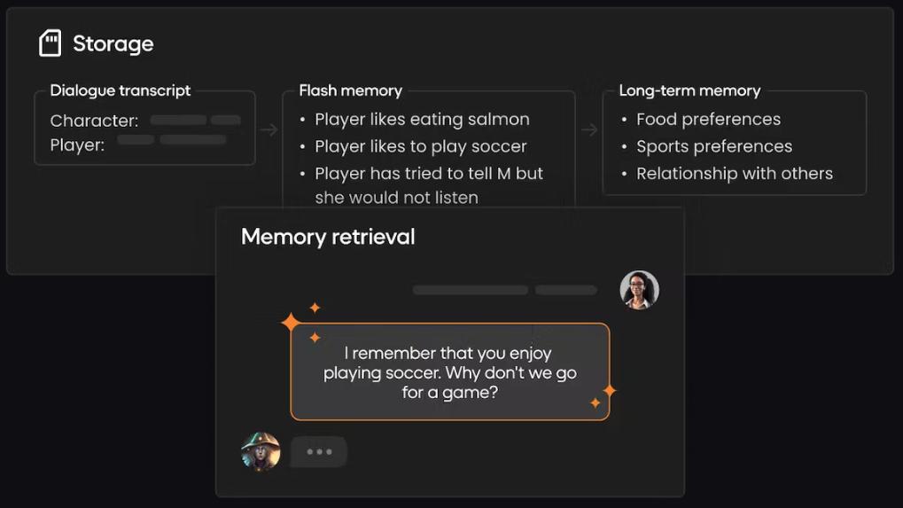 角色通过从闪存和长期记忆中检索信息,以类似人类的记忆功能进行操作,从而创造出玩家返回的引人入胜的体验。