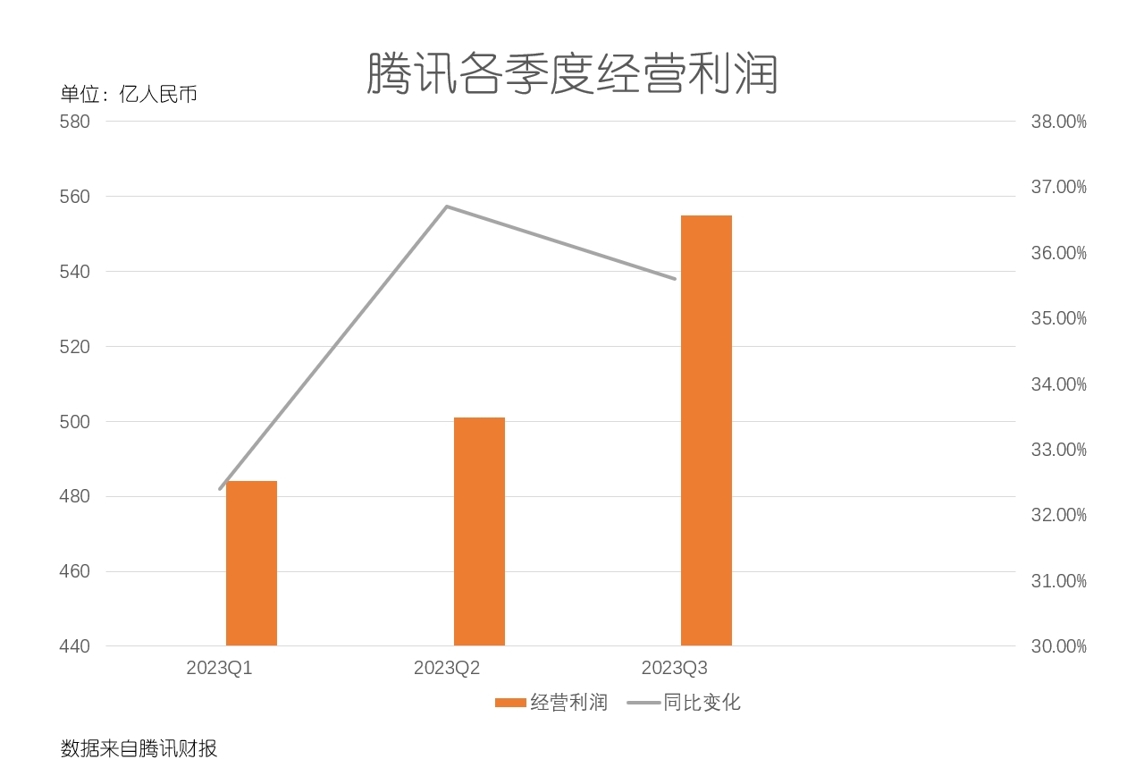 营收端正如上文所言没有太大惊喜,今年前三季度腾讯总收入分别录得1500、1492和1546亿元,同比增速一直徘徊在10%左右,和市场预期也基本一致。利润和成本这一侧则不乏亮点,其中,今年前三个季度的Non-IFRS经营利润分别录得484、501和555亿元,同比增速分别高达32.4%、36.7%和35.6%。