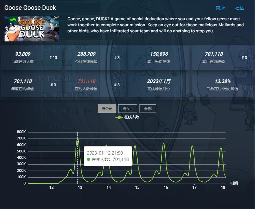 今年初,各大平台的头部主播都在直播一款叫做《鹅鸭杀》的游戏,主播自发“带货”,吸引了不少玩家去一探究竟,Steam(游戏平台)数据统计显示,《鹅鸭杀》单日在线人数最高突破70万人,冲上Steam游戏在线人数历史峰值第八名,而这70W人只是游戏服务器承载极限。