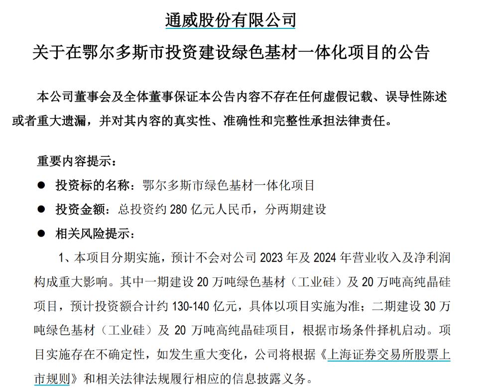 根据通威股份发布的公告显示,该公司拟在鄂尔多斯市投资建设绿色基材一体化项目,预计投资金额约280亿元。
