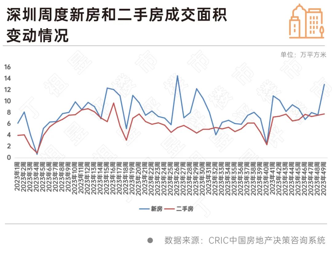 据CRIC监测数据,从深圳新政发布的47周(11.20-11.26)开始,近3周新房成交量较11月新政前周均成交稳中有增15%,至第49周(12.4-12.10)单周成交量达12.97万平方米,达近一年来次高。而二手房周度成交走势呈现稳步爬升态势,近3周周均成交量达到7.5万平方米,显著高于新政前2023年周均5.8万平方米。
