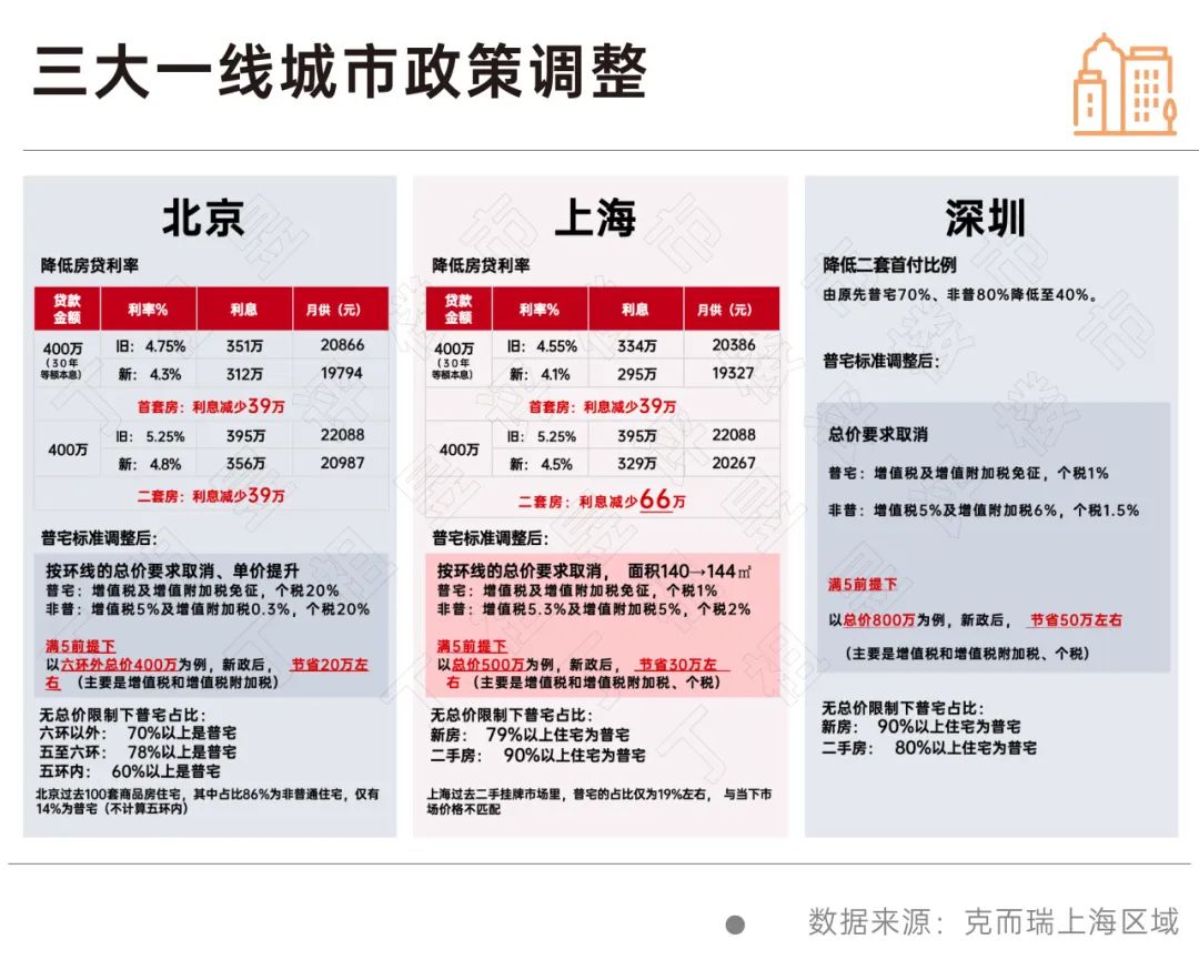 对比三大一线城市新政内容来看,北上深二套首付比例全部最低降至40%,同时普通住宅认定标准各有下调。