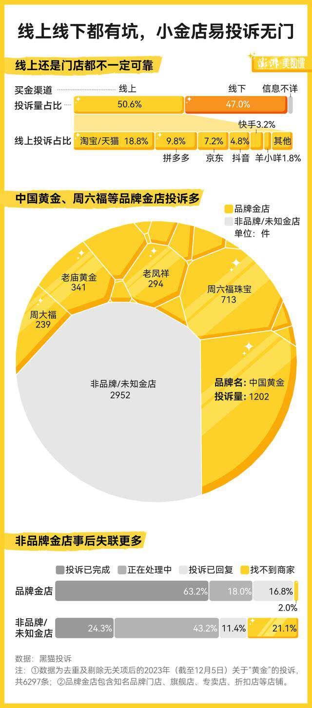 而根据此前澎湃新闻整理的图表可以看到,购买金饰时,商品本身问题,引发消费者集中吐槽的问题主要是含金量不足、掉色变形等,在交易中遇到问题较多的是一口价、虚假/不开发票等问题,而在售后上,商家跑路、退换货难也成为重灾区。
