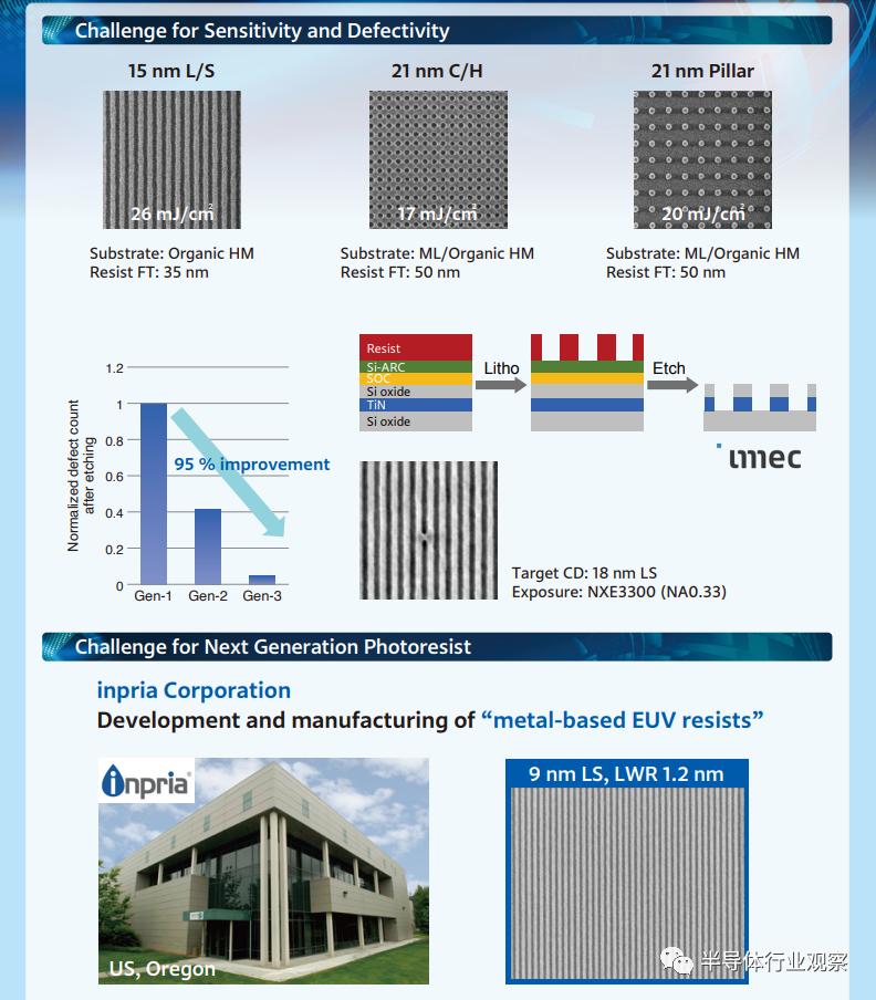 对此,业内曾提出两种解决方案:一种是将光源提高到500W-1000W,并因此获得更高的能量来确保量产,但目前500W以上的光源仍在研发中。而第二种解决方案,便是通过改善EUV光刻胶技术,来实现曝光功率以及机器工作效率的平衡,干式光刻胶也因此受到市场的关注。