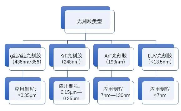 对光刻胶分辨率等性能要求不断提高,光刻技术随着集成电路的发展经历了从G线(436nm)光刻,H线(405nm)光刻,I线(365nm)光刻,到深紫外线DUV光刻(KrF248nm和ArF193nm)、193nm浸没式加多重成像技术(32nm-7nm),再到EUV极端紫外线(<13.5nm)光刻的发展,甚至采用非光学光刻(电子束曝光、离子束曝光),以相应波长为感光波长的各类光刻胶也应用而生。