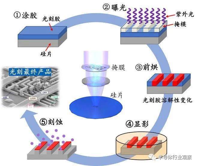 此后用特定溶剂洗去被照射/未被照射的光刻胶,就实现了电路图从掩模到硅片的转移。光刻完成后对没有光刻胶保护的硅片部分进行刻蚀,最后洗去剩余光刻胶,就实现了半导体器件在硅片表面的构建过程。