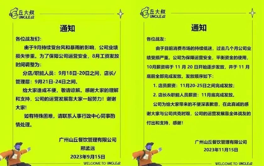 对此,丘大叔相关负责人回应,“丘大叔并未拖欠员工工资,但确实出现了延迟发放的情况。对于薪资发放延迟的问题,公司深表歉意。我们不强调大的经营环境差等各种客观因素,公司已经在积极的解决问题,但并非如网络言论所述公司存在‘恶意拖欠’、‘倒闭’、‘爆雷’等情况。”