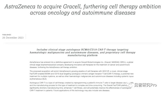 12月26日,阿斯利康宣布已经与中国biotech企业亘喜生物(纳斯达克代码:GRCL)达成最终收购协议。