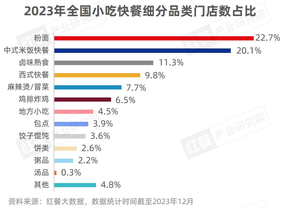 小吃快餐细分品类较多,各个赛道都有代表品牌冒头。具体来看,在细分品类中,粉面、中式米饭快餐、卤味熟食的门店数占比位列前三,分别达到22.7%、20.1%、11.3%。