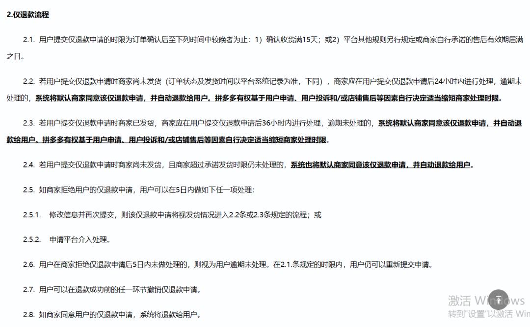 而拼多多的仅退款流程页面,并没有对商家以及用户做过多描述。仅多次提到“拼多多有权基于用户申请、用户投诉/或店铺售后等因素自行决定缩短商家处理时限。”