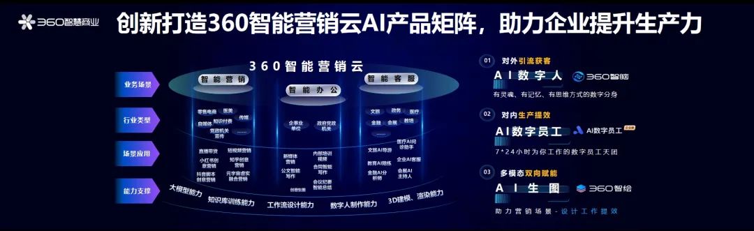 依托大模型能力、知识库训练能力、Agent Studio、数字人等技术的支撑,360智能营销云已陆续推出了AI数字人、AI数字员工、360智绘等产品,用AIGC赋能营销全链路。