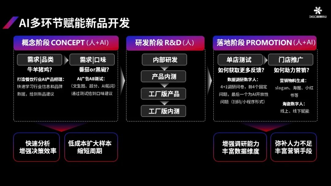 按照一般的餐饮新品开发流程,通常需要历经需求收集、内部研发、产品内测、工厂版产品、工厂版内测、单店测试和全门店推广七大步骤。但是,在AIGC的加持下,整个流程大幅缩减,效率也随之大大提升。
