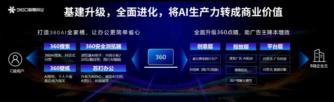 在用户侧,360智脑已经全面接入360搜索、360安全浏览器等全端产品。在企业侧,360旗下的智能营销平台——360点睛也实现了全面升级。