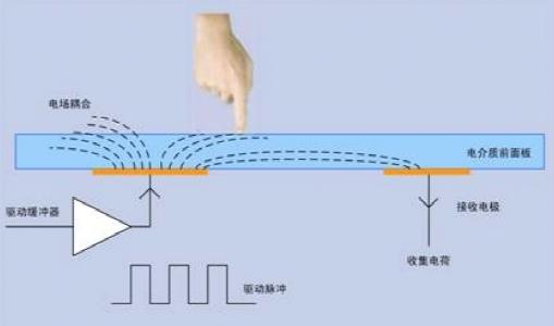 电容式触摸屏是利用人体的电流感应进行工作的,当手指触摸在金属层上时,能形成一个耦合电容,手指能吸走一个小电流。