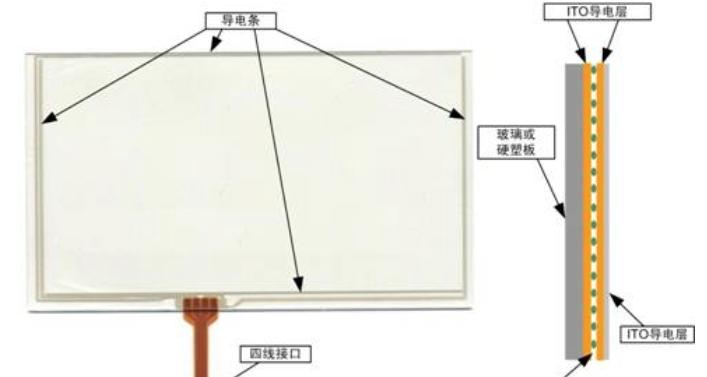 小电流分别从触摸屏的四角上的电极中流出,控制器通过对这四个电流比例的精确计算,得出触摸点的位置。