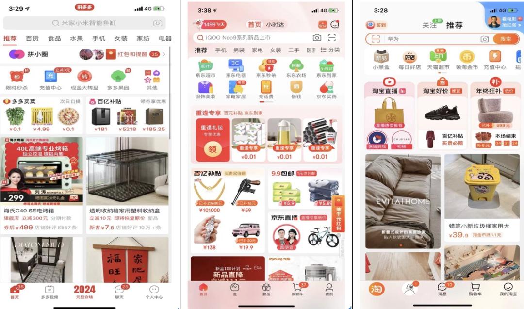 另镜对比拼多多、京东和淘宝App,和以前相比,现在三家推荐页面相似度较高,其中包括限时秒杀、补贴、推荐曾搜索过的物品等。