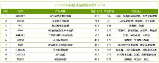 图:2022年抖音贴片面膜销量榜TOP10,来源:电商平台数据