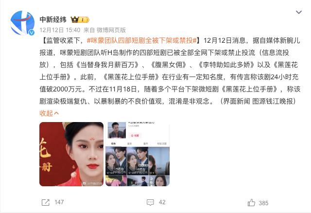 在《黑莲花上位手册》宣告下架一个月之后,咪蒙团队制作的四部短剧被全网下架。(图/微博)