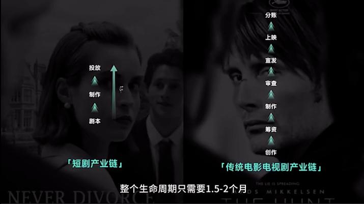和传统的影视变现不同,短剧是“结果导向”的。一部短剧开机一周后便杀青,经过二十几天的后期制作剪辑,就可以投入市场发行,完成流量转化。这与传统影视需要历经筹备、建组、制作、宣发等流程相比快得多,收入回报也快得多。