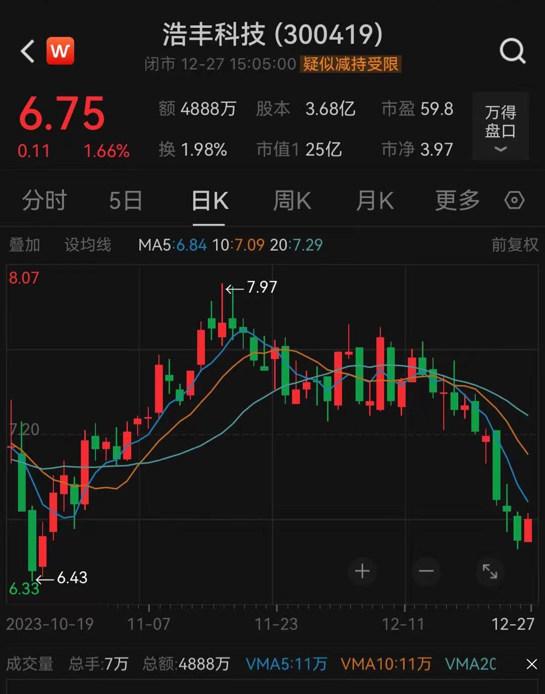 12月27日收盘,浩丰科技每股报6.75元,上涨1.66%,最新市值为25亿元。