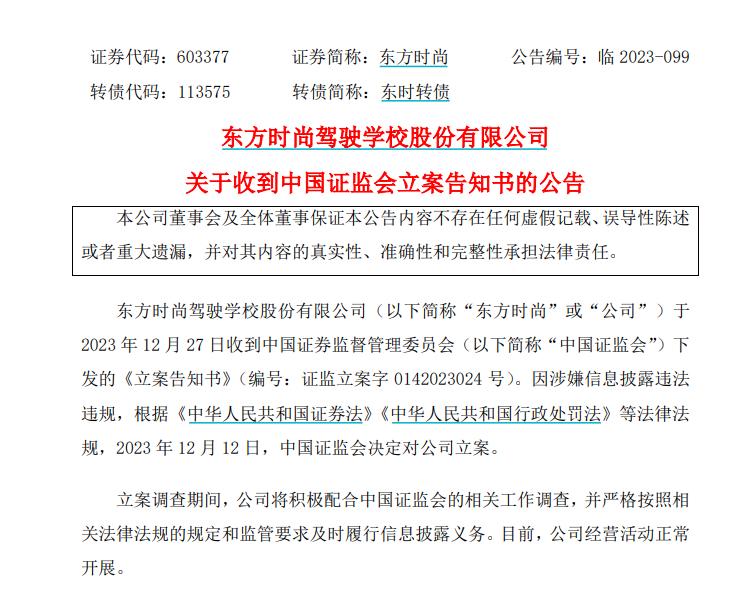 12月27日,东方时尚发布公告称,公司于当日收到中国证监会下发的《立案告知书》。因涉嫌信息披露违法违规,根据《中华人民共和国证券法》《中华人民共和国行政处罚法》等法律法规,12月12日,中国证监会决定对公司立案。