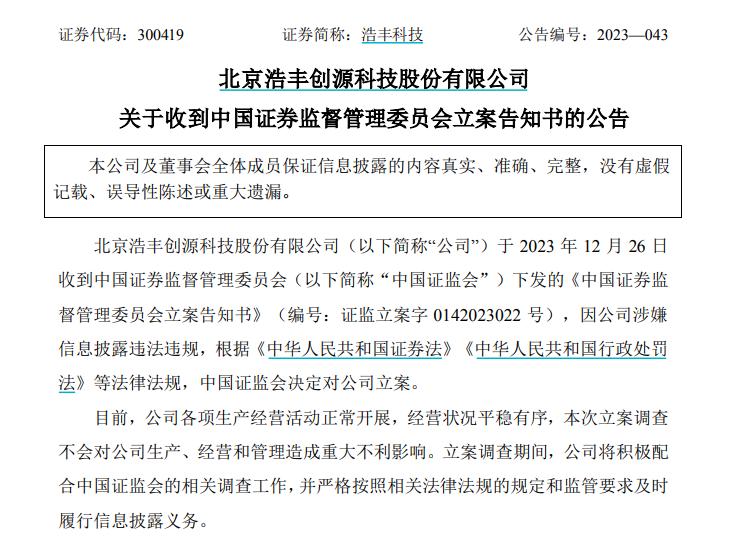 12月27日,浩丰科技发布公告称,公司于12月26日收到中国证监会下发的《中国证券监督管理委员会立案告知书》,因公司涉嫌信息披露违法违规,根据《中华人民共和国证券法》《中华人民共和国行政处罚法》等法律法规,中国证监会决定对公司立案。