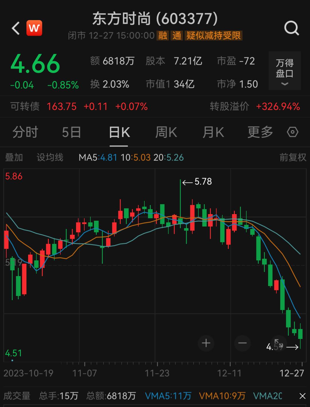 12月27日收盘,东方时尚每股报4.66元,下跌0.85%,最新市值34亿元。