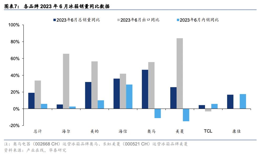 根据华泰证券,表现突出的是以下几类商品:冰箱、洗衣机在欧洲需求大增;空调在亚洲和南美增速较快。它们的出口销量增速均好于内销。以冰箱为例,今年6月,海尔、美的的外销同比增速都在50%-60%,内销同比增速分别为2.6%、10.0%。