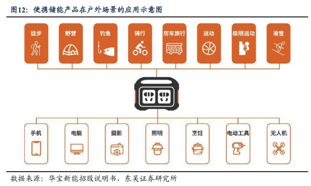 便携式储能产品是新能源储能的一个分支,属于消费电子产品,也叫做移动电源。应用场景以户外用电和家庭应急用电为主,包括便携储能产品及其配套的太阳能板等,可以给消费电子产品、家电、电动车等充电。便携式储能最大的市场是美国、日本及海外其他发达地区,头部出海公司有华宝新能、正浩创新等。
