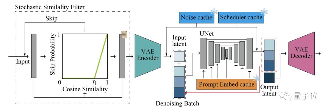 StreamDiffusion Pipeline包含六大组件:Stream Batch、残差无分类器指导(RCFG)、输入-输出队列、随机相似性过滤器、KV-Caches预计算、带有小型自动编码器的模型加速工具。