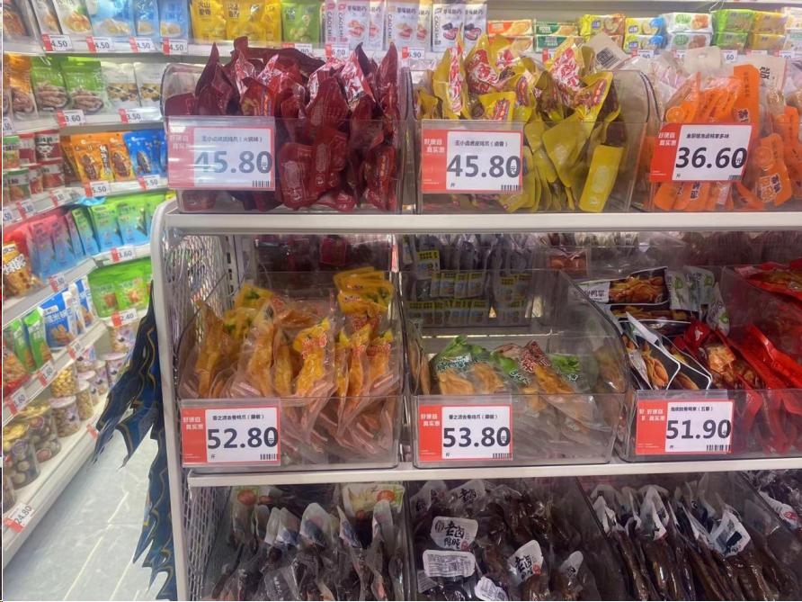 比如在当地一家零食折扣店内,一斤鸡爪价格高达40-50元,但拼多多、抖音、淘宝一斤鸡爪价格也才在20元左右。乡镇消费者必然会觉得零食折扣店商品太贵了,随便购买几件零食,就要七八十元。