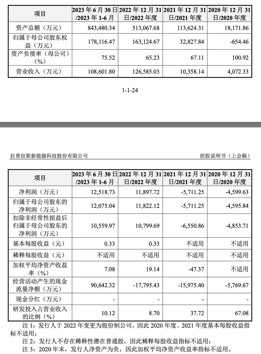 招股书显示,2020-2022年及2023年上半年(下称:报告期),拉普拉斯营业收入分别约为4072.33万、1.04亿、12.66亿、10.86亿元;扣非归母净利润分别约为-4853.71万、-6550.86万、1.08亿、1.06亿元,于2022年实现扭亏为盈。