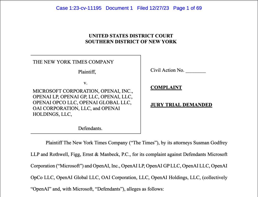 纽约时报送OpenAI、微软上被告:GPT-4输出结果与其作品有大量重复