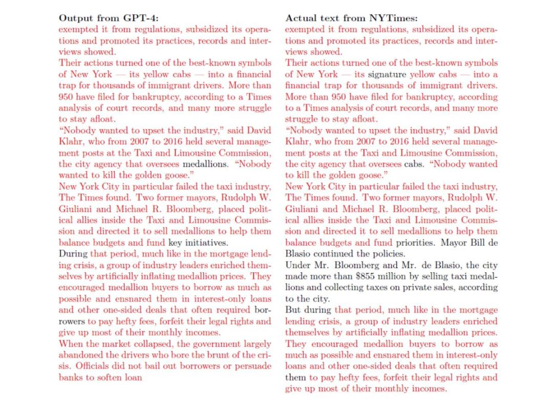 其次,申诉书中提供了一看就懂的抄袭证据。下图中,红色是完全重合的文本,黑色是 GPT 新生成的文本,大量重复将一目了然。Ziniti 认为,除非 OpenAI 对 GPT 训练方式作出大调整,或者通过大量的法律手段说明技术原理,否则 OpenAI 根本无力辩护。选择和解比继续对抗更加明智。