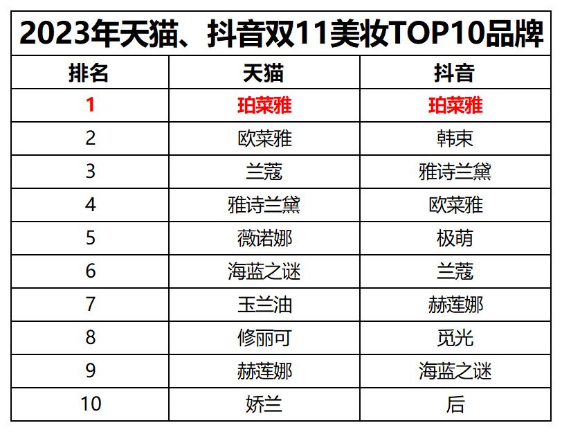 今年双11,珀莱雅取得天猫、抖音美妆行业第一,这也是国货品牌自2018年以来首次登顶天猫双11美妆榜。但抖音和天猫双11TOP10榜单中,仍以国际大牌为主。