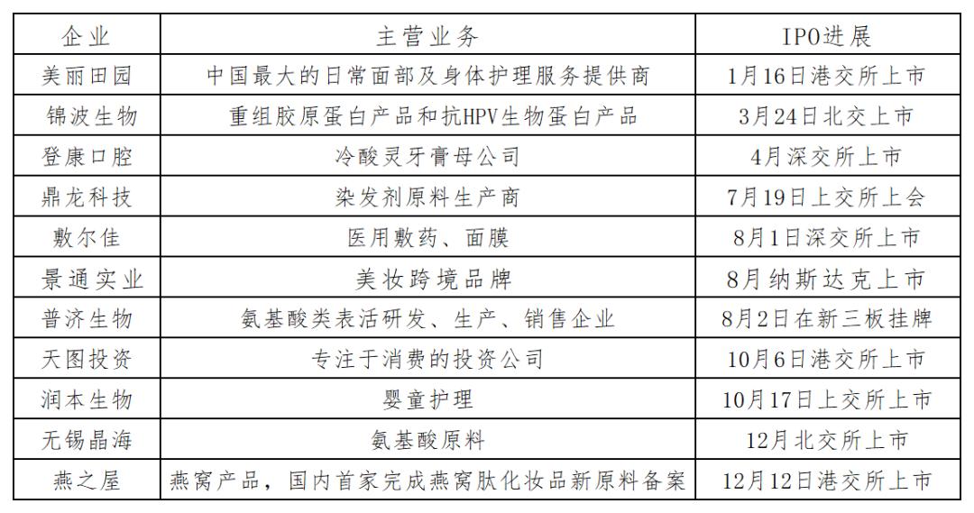 其三,融资难、拓品难、研发难三难问题,后续将会更加突出。IPO前退出曾是资本市场套利的重要方式。但随着今年IPO的收紧,国内仅有11家美妆企业完成上市。毛戈平、蜜思肤、环亚、芭薇股份、拉拉米、湃肽生物等企业纷纷中止IPO。