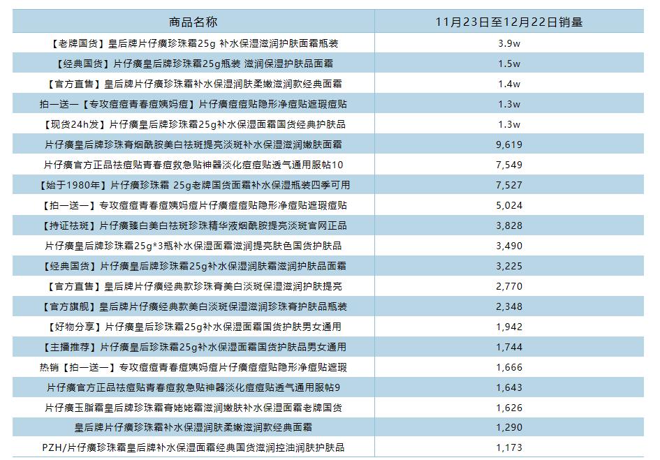 另据达多多数据显示,11月23日至12月22日片仔癀多款美妆商品链接销量均低于4万,且这些销量均由皇后珍珠面霜一款产品所支撑。马应龙多款美妆销量不足1万,云南白药泰邦TB祛痘凝销量更是为0。若考虑到美妆行业15%—20%的退款率,真实销量可想而知。换言之,美妆业务目前对片仔癀、马应龙、云南白药收入贡献有限。