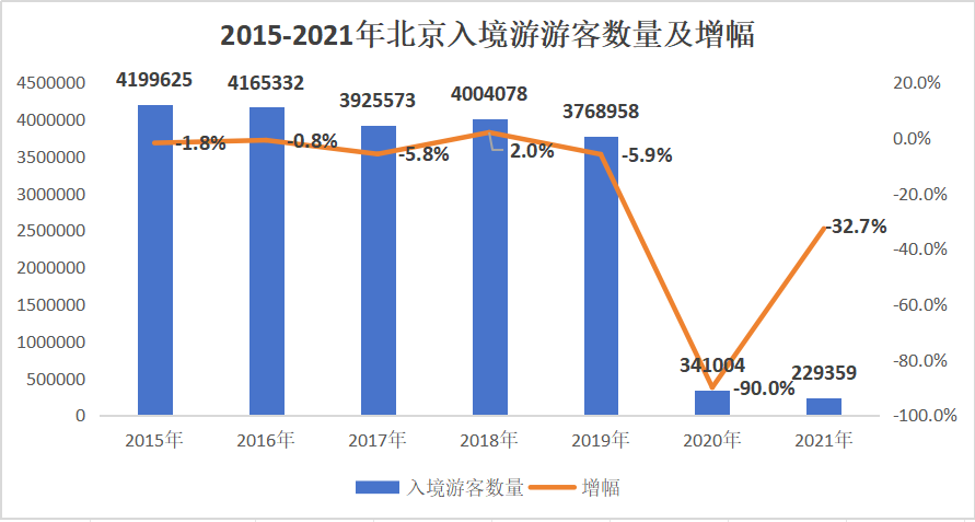 2015年-2019年,作为入境游引擎的北京,海外游客人次持续下滑,从4199625人次跌到3768958人次,除了2018年同比出现2%微弱增幅外,其余年份均为负增长,2019年增幅更是达到-5.90%,创下疫情前5年内新低。