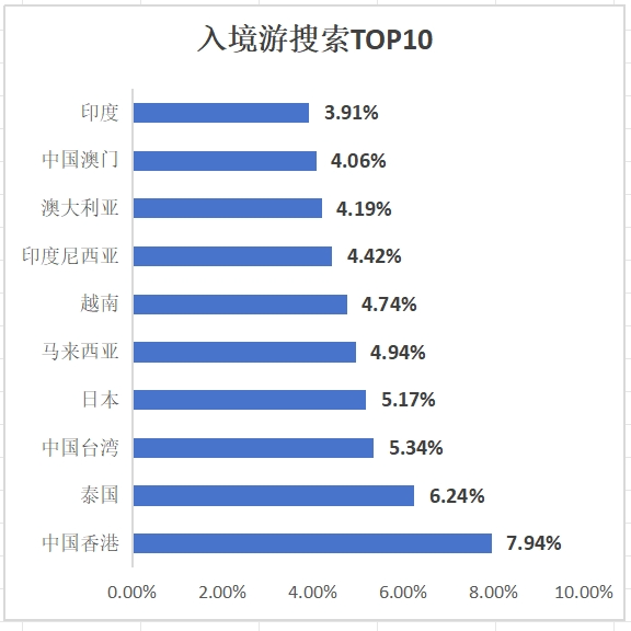 《报告》显示,海外游客在搜索中国境地旅游目的地的同时,除了港澳台外,重点搜索泰国(6.24%)、日本(5.17%)、马来西亚(4.94%)和越南(4.74%)等周边国家。尤其是日本和泰国,成为中国最大的竞争对手,吸引大量欧洲客源。