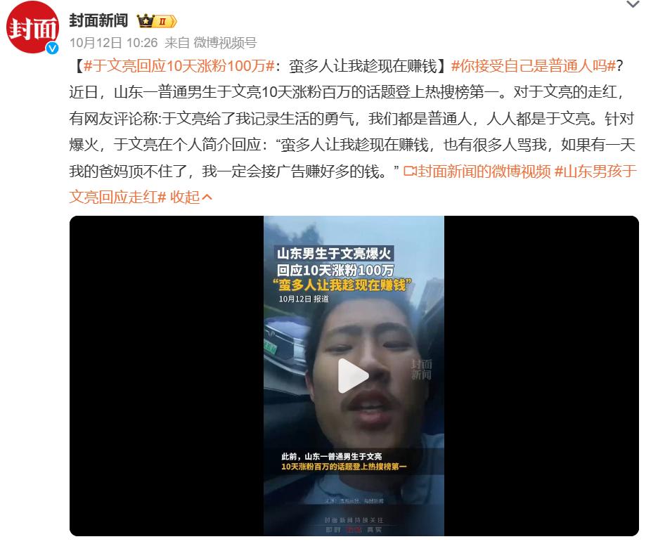 其余几十条视频也都以记录日常为主,没有整活网红们溢出屏幕的“乐子感”,只有晃动的画面和一张比画面更晃动的大脸,这张脸介于“丁真”们与“小阿giao”们之间,10天涨粉200万。于文亮确实是普通人,但也确实让用户们看不懂。