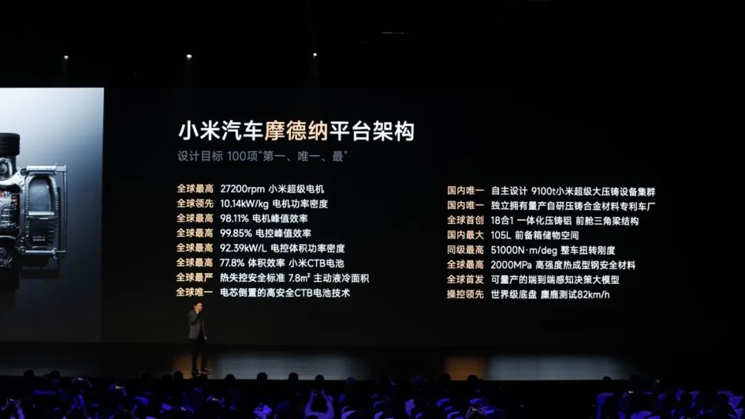 会上,雷军在分享小米对于造车思考的同时,推出小米汽车首个技术架构平台——摩德纳,介绍了小米汽车在技术上的100项“第一、唯一、最”,以及小米引以为傲的汽车工程团队。