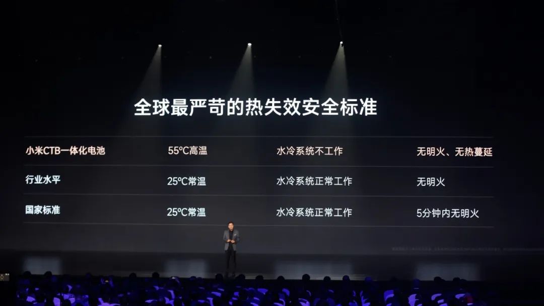 小米在电池上采取了14层物理防护和高于行业的安全检测标准,确保电池在水冷失效的情况下还可以不出现明火。